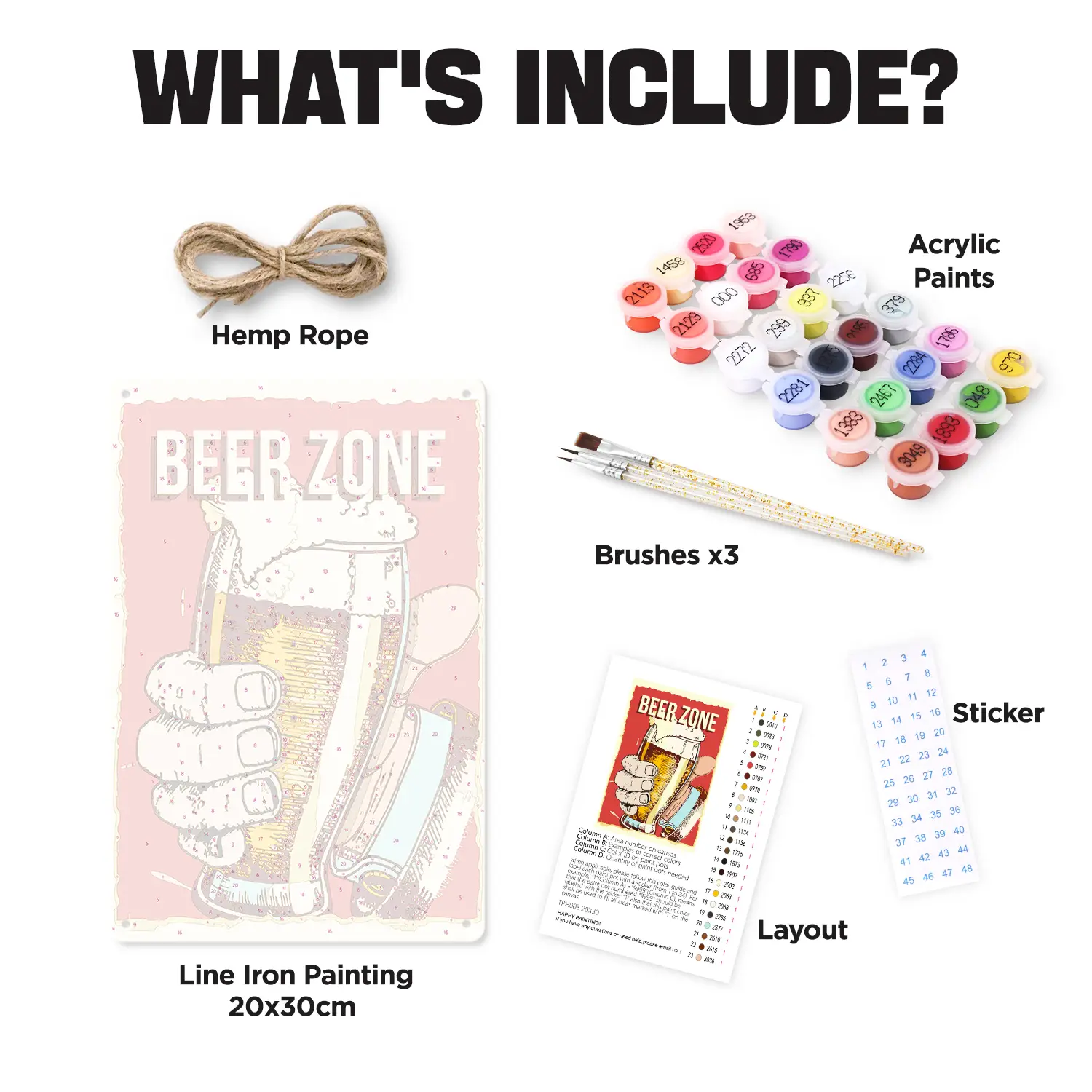 Verschönern Sie Ihre Bar oder Ihr Zuhause mit dem Beer Zone DIY Metallposter. Dieses Vintage-Poster misst 20×30 cm (7.8×11.8 Zoll) und verfügt über abgerundete Ecken für einen eleganten Look. Perfekt, um einen Hauch von Nostalgie hinzuzufügen, ist es ideal für alle, die einzigartige Dekorationen lieben. Die Metalloberfläche verleiht ihm eine robuste, langlebige Qualität. Gestalten Sie einen personalisierten Raum, der Ihren Stil widerspiegelt, mit diesem DIY Malen-nach-Zahlen-Metallposter.