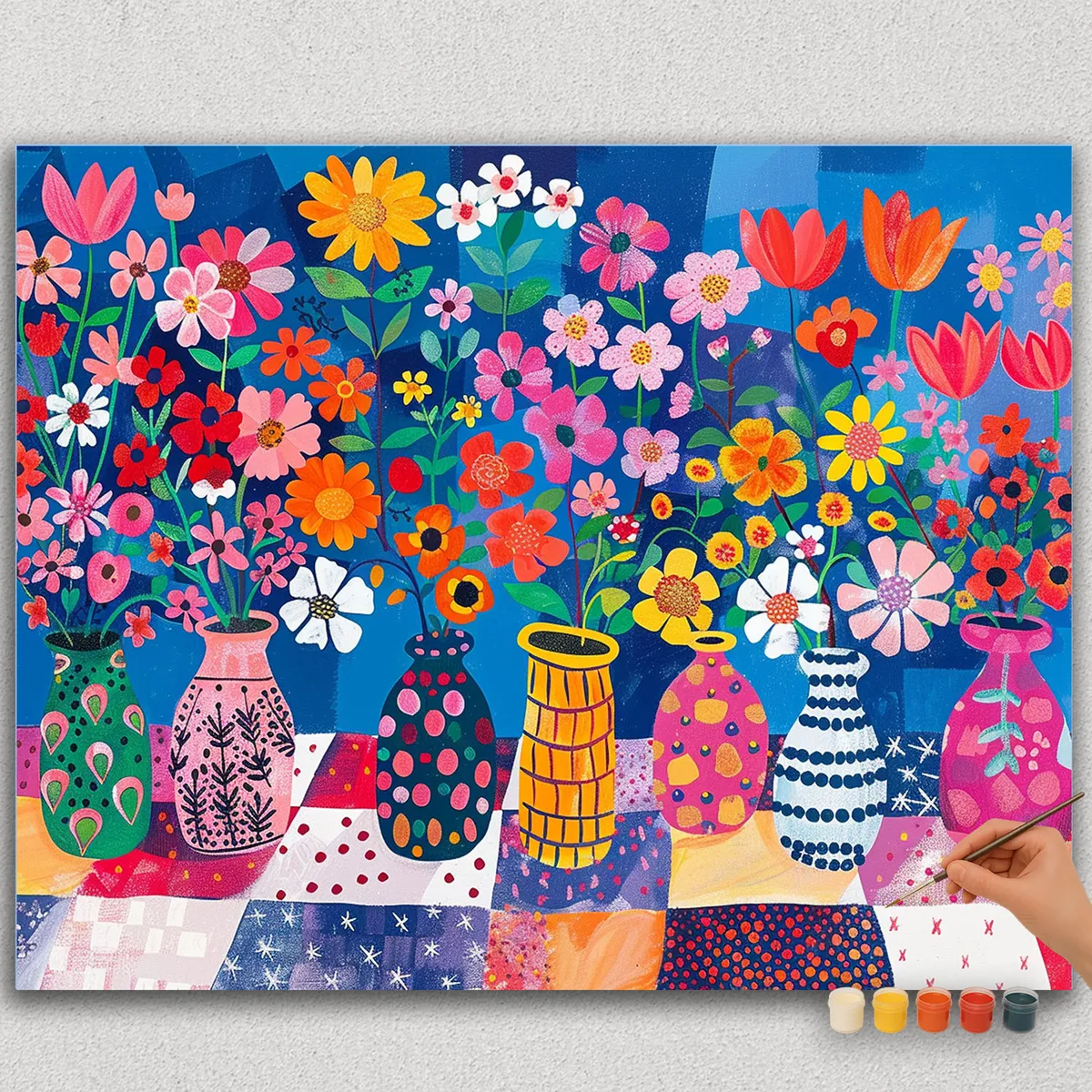 Verwandeln Sie Ihren Raum in einen farbenfrohen Garten mit unserem DIY-Malset – Bunte Töpfe und Blumen. Dieses Malen-nach-Zahlen-Set lässt Sie ein helles, fröhliches Kunstwerk aus blühenden Blumen in lebendigen Keramiktöpfen gestalten.