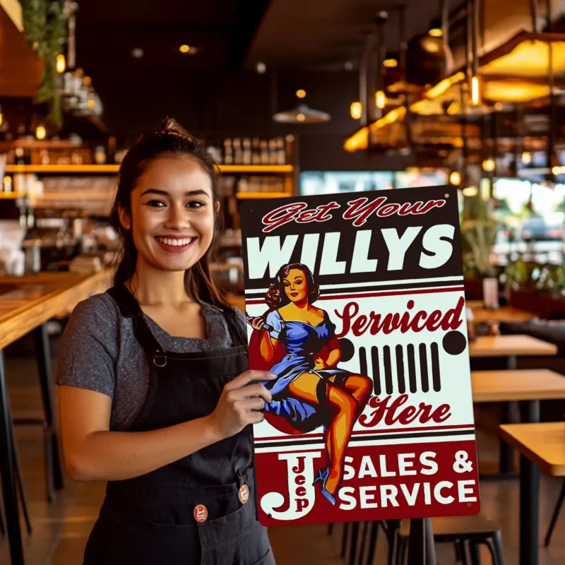 Verleihen Sie Ihrem Zuhause oder Ihrer Bar einen Hauch von Vintage-Charme mit dem DIY Metallposter „Willys Service“. Dieses einzigartige Stück misst 20x30cm oder 7,8×11,8 Zoll und hat abgerundete Ecken für ein elegantes Finish. Das Vintage-Design macht es zu einer perfekten Ergänzung für Liebhaber klassischer Themen. Es ist eine hervorragende Möglichkeit, Ihren Raum mit einem nostalgischen Gefühl zu personalisieren.