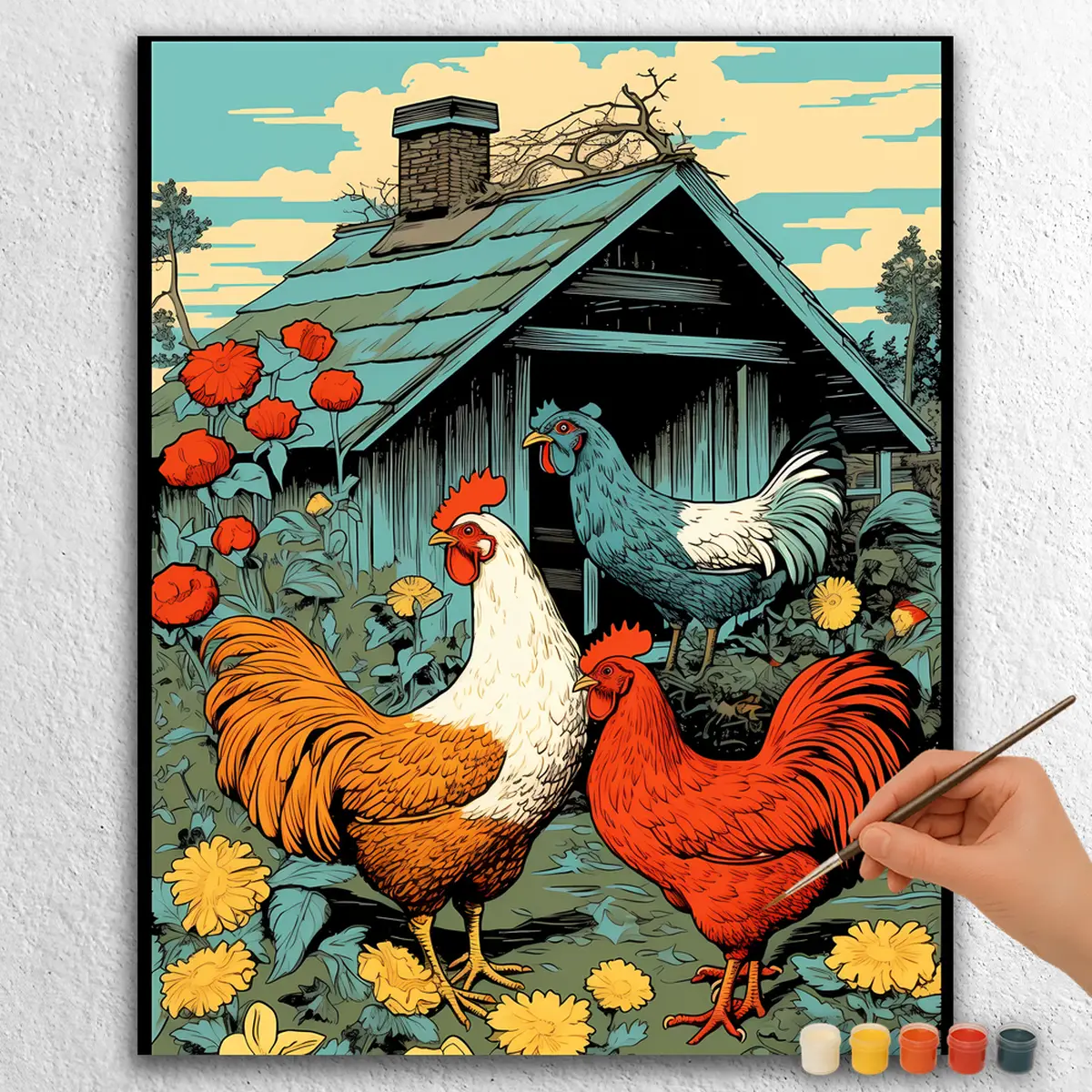Holen Sie sich den Charme des Landlebens mit Hahn und Henne, einem zauberhaften Malen-nach-Zahlen-Set. Diese wunderschöne Szene zeigt einen stolzen Hahn neben einer sanften Henne, eingebettet in eine idyllische Kulisse. Perfekt für Anfänger oder erfahrene Künstler, enthält dieses Set alles, was Sie benötigen, um ein beeindruckendes Kunstwerk zu schaffen. Entspannen Sie sich beim Malen und genießen Sie die therapeutischen Vorteile, diese liebliche Szene zum Leben zu erwecken.