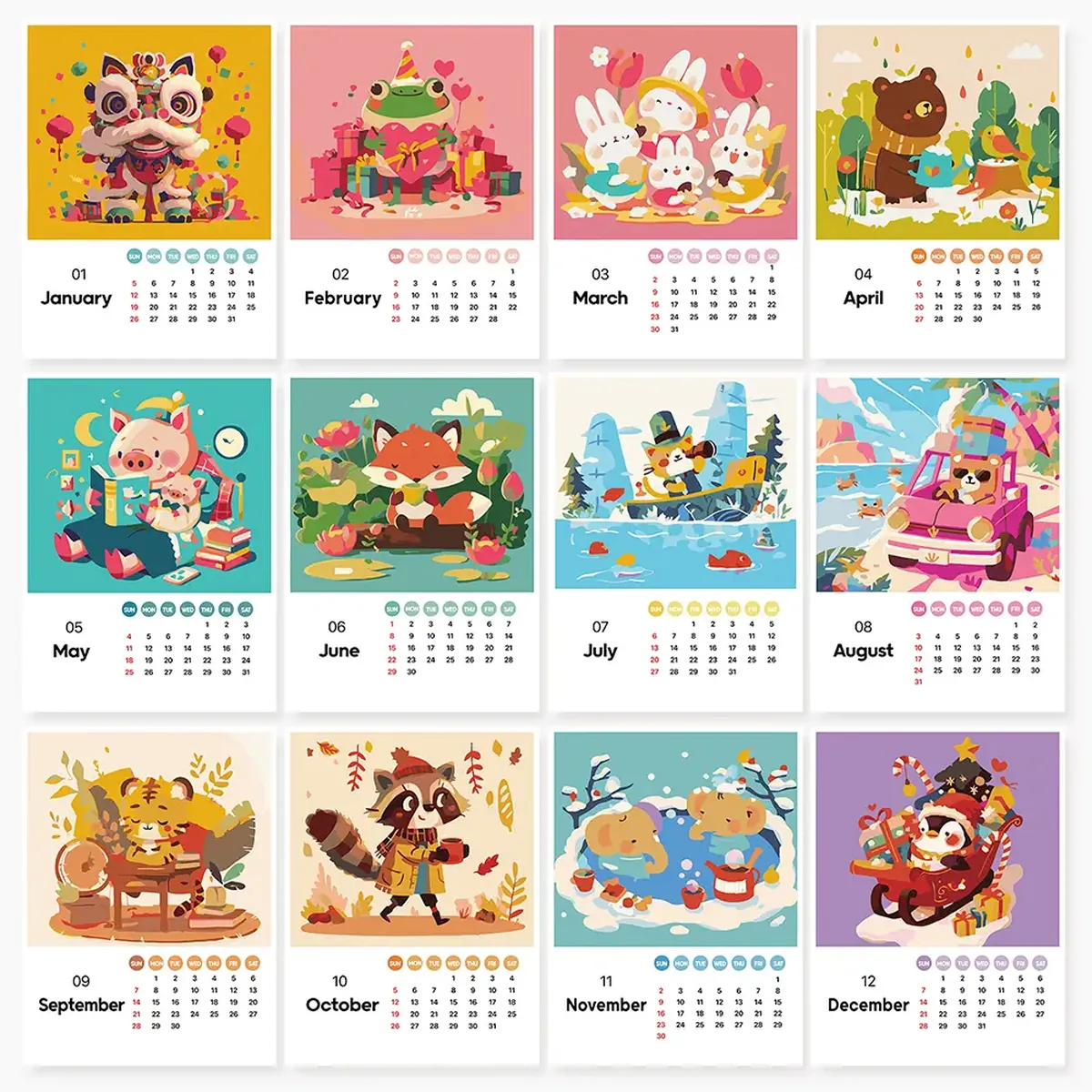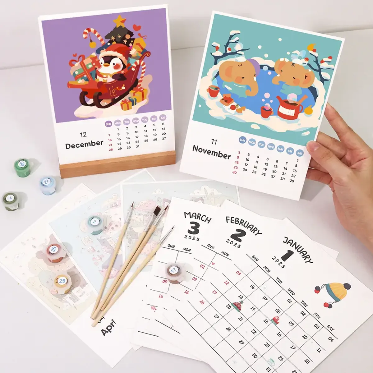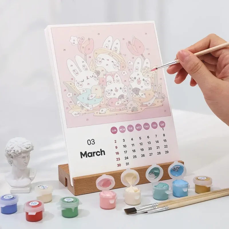 Sie erhalten das gesamte Zubehör, das Sie benötigen, um Ihren Malen-nach-Zahlen-Kalender fertigzustellen. Sie erhalten die folgenden Werkzeuge und Zubehörteile –- 12-Monats-Kalenderkarten