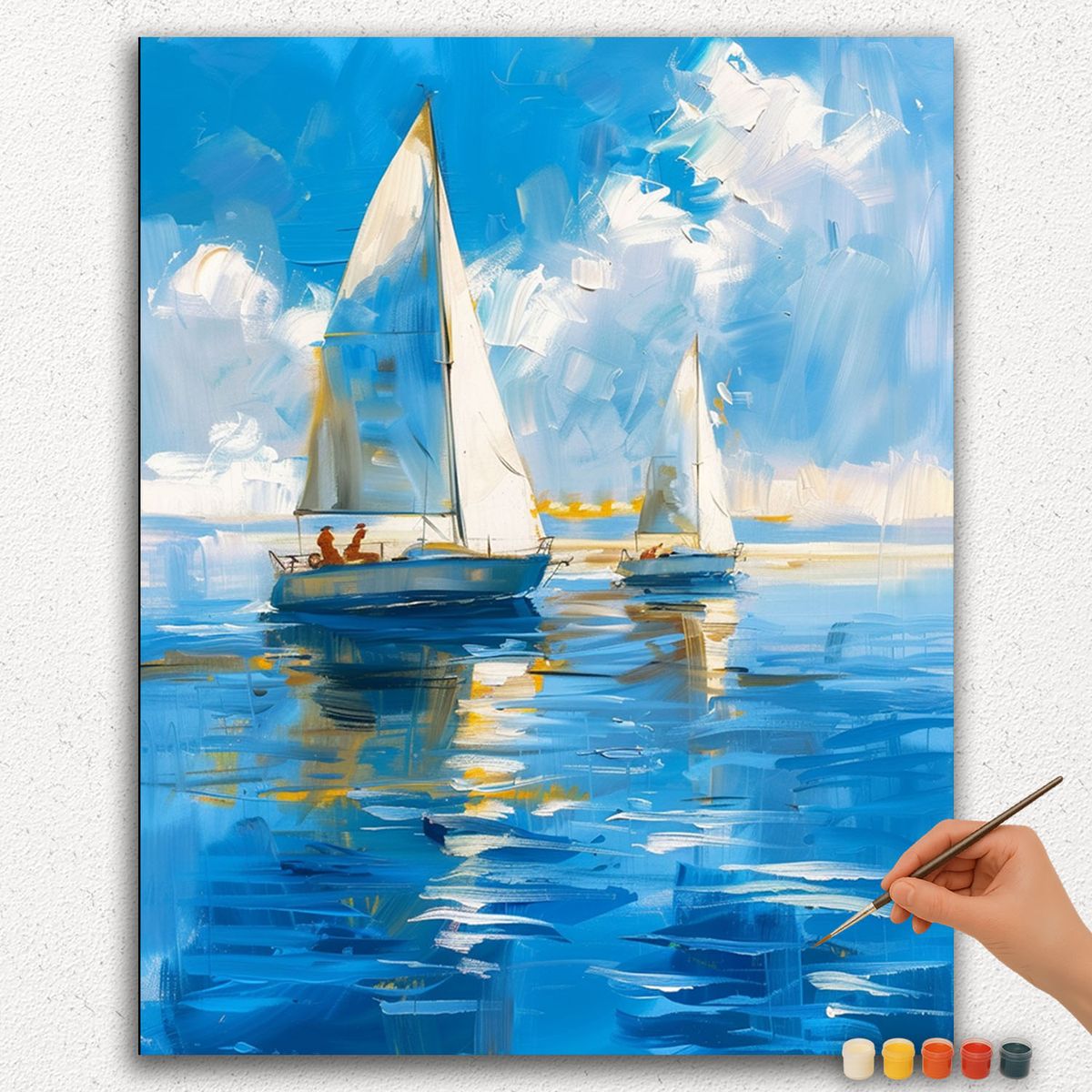 Bringen Sie die Gelassenheit des Meereslebens in Ihr Zuhause mit unserem DIY-Malset „Zwei Boote im blauen Wasser“. Dieses Malen-nach-Zahlen-Set zeigt eine ruhige Meereslandschaft mit zwei Booten, die auf sanft blauem Wasser schwimmen.